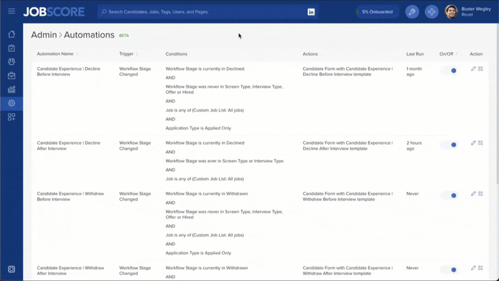 The automations feature is currently in closed beta. If you’d like to be among the first to try it out, please email support@jobscore.com.