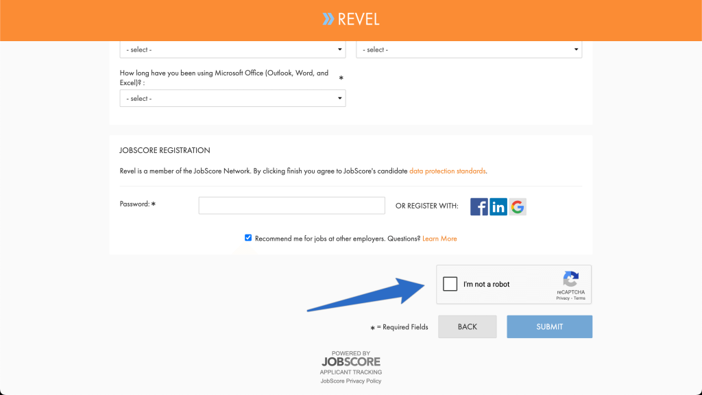 We’ve added Google’s reCAPTCHA to JobScore-hosted job application forms, which helps protect you from spam and abuse. It shows a checkbox that asks applicants to confirm they are not a robot: